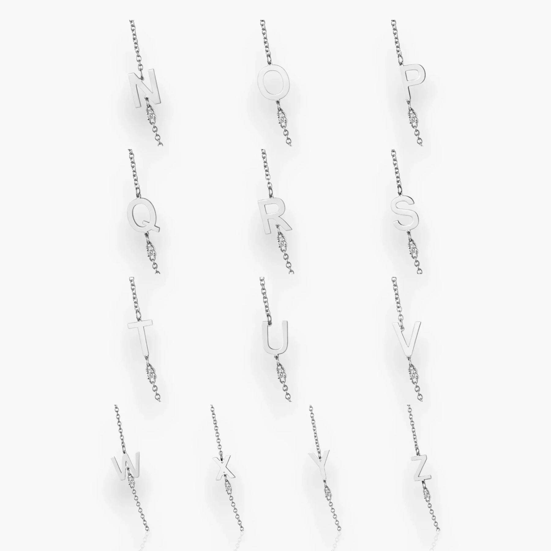 18kt white gold necklace with one or two letter(s) set slightly to the side of the chain. Available in yellow, rose, and white gold and customizable with the letter of the alphabet of your choice.